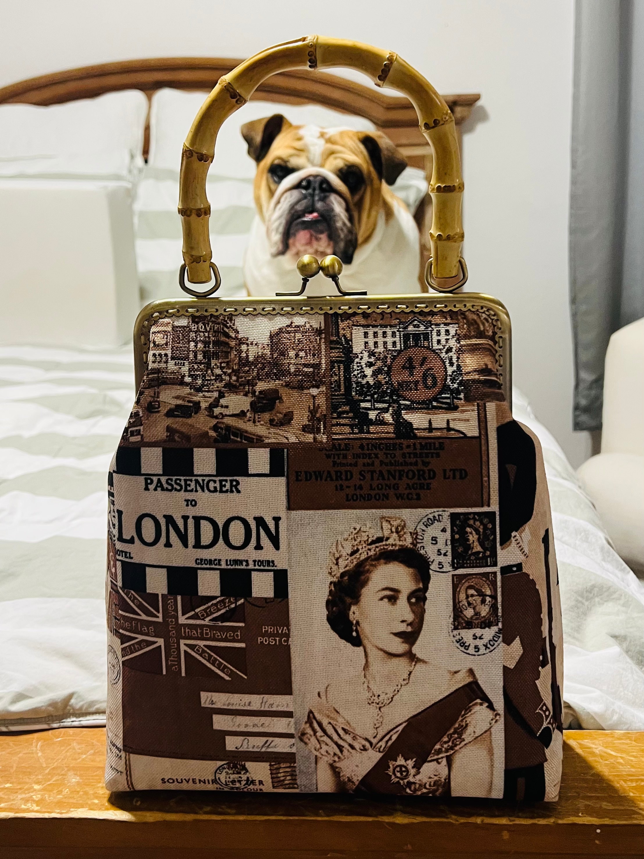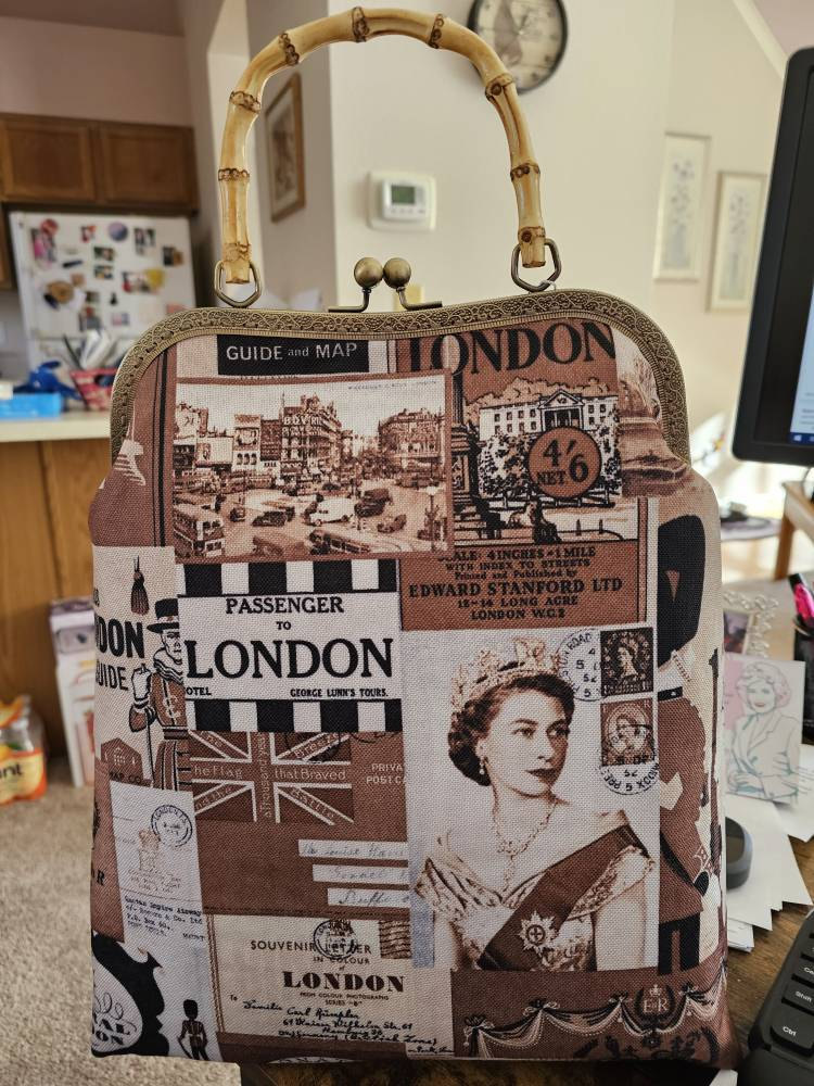 Please let me know the letters you want, or send me your Logo picture when you place your order.This handmade kiss lock clutch bamboo top handle frame purse is designed and handmade by me with limited vintage Queen Elizabeth London printed high-quality wear-resistant fabric and a gorgeous bamboo top handle frame.